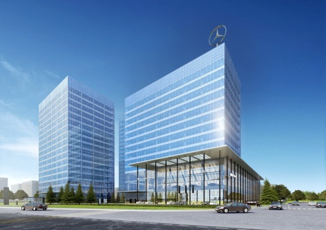 项目位于沈阳市皇姑区,一环路以内,北临崇山东路(一环路),西临柳条湖街。总建设用地23,377.6平方米。项目一共分为A、B、C三个地块,奔驰东北中心位于A地块,总建筑面积约5.8万平方米,地上13层、地下3层。主楼为办公楼,副楼裙房为奔驰4S店。
